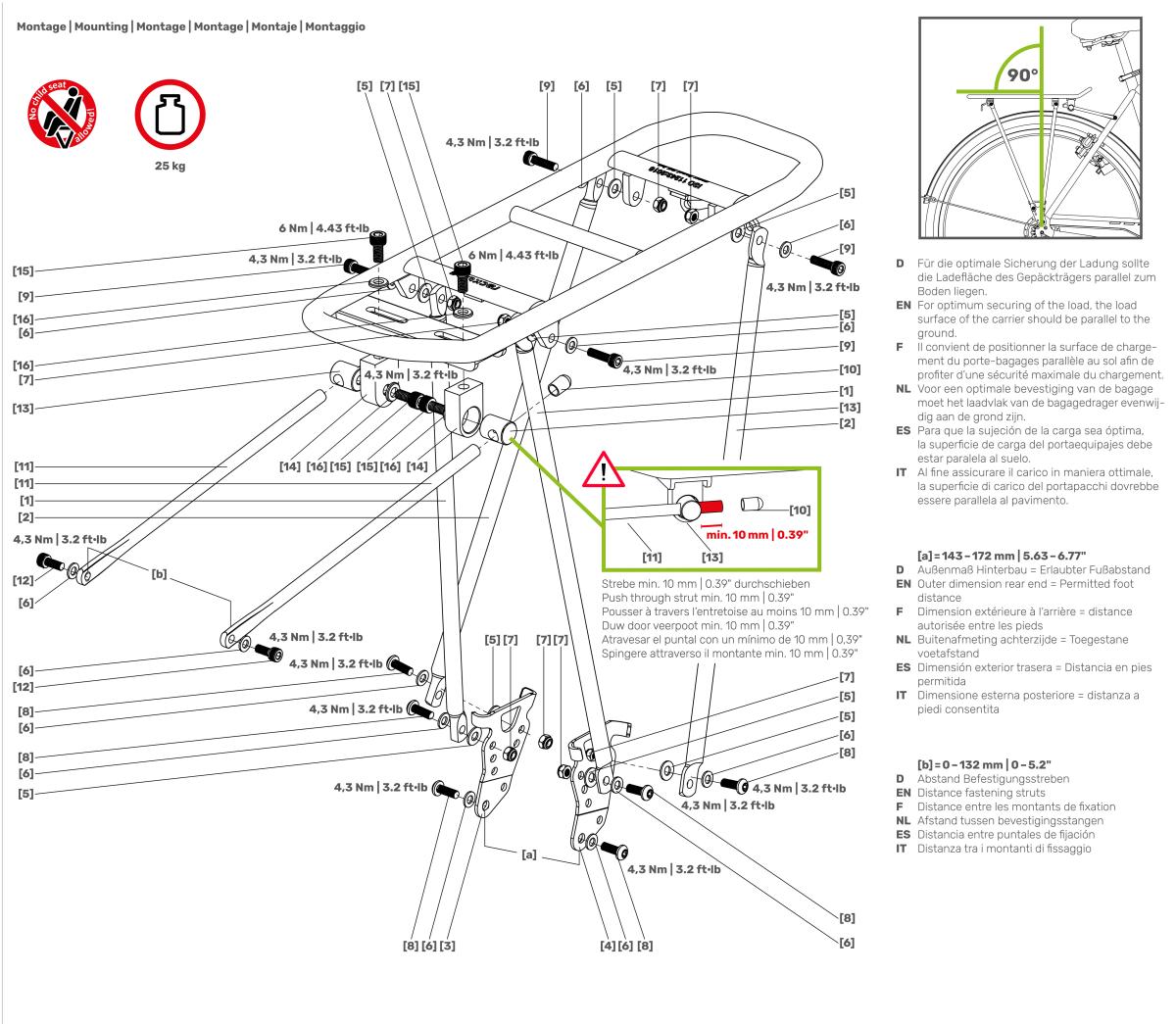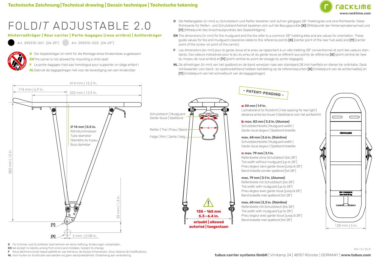 Hátsó csomagtartó kerékpárra. Kerékméret: 24-29. Súly: 845 g. Cső átmérő: 14 mm. Maximális gumiszélesség: 60 mm. Maximális sárvédő szélesség: 68 mm. Terhelhetőség: 25 kg. Magasság: 363-383 mm. Megengedett maximális támasztótávolság: 132 mm. Megengedett távolságtartás: 143-172 mm.
