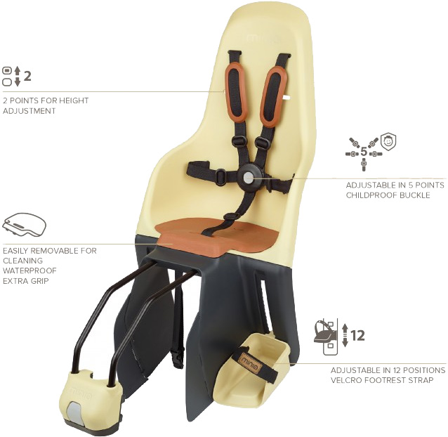 Hátsó kerékpáros gyerekülés csomagtartóra. Összehajtható design. A Polisport Minia kerékpáros hátsó gyerekülés könnyű, praktikus, ezzel a nyári vakáció elengedhetetlen tartozéka. Szerettesse meg kisgyermekével még az önálló bringázás előtt a kerékpározás szépségeit. Higgye el megéri! Amint a kicsi önállóan képes ülni, akkor már a Polisport hátsó gyerekülései is használhatók.