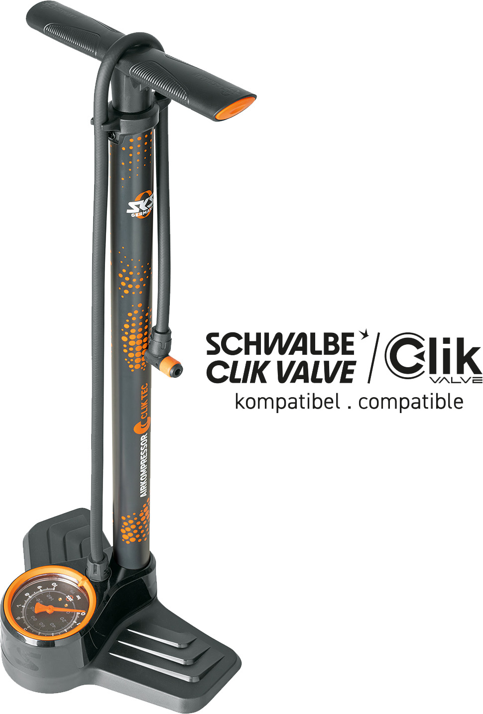 Műhelypumpa SKS CLIK TEC pumpafejjel. Az AIRKOMPRESSOR CLIK TEC 10.0 hatékony pumpateljesítményével és innovatív technológiájával tűnik ki. Az SKS CLIK TEC pumpafejjel felszerelve a pumpa tökéletesen illeszkedik a Schwalbe Clik szelep rendszeréhez. A szelepfej mindössze két ujjal könnyedén kezelhető, és levételkor megakadályozza a nyomásvesztést. A levegőáram 50%-kal nagyobb, mint a hagyományos Presta szelepek esetében.