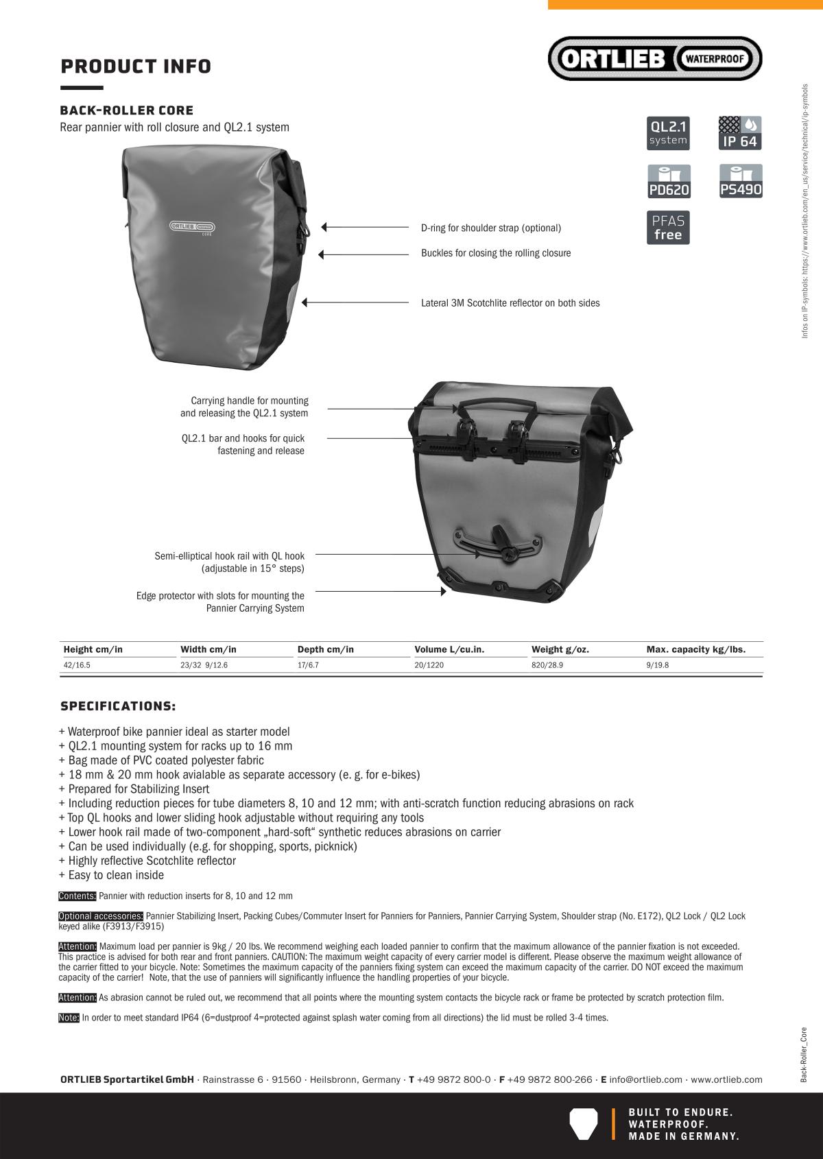 Kétoldalas csomagtartó táska. Magasság: 42 cm. Szélesség: 32 cm. Mélység: 17 cm. Térfogat: 20 L. Teherbírás: 9 kg. Súly: 820 g. Rögzítés csomagtartóra: Quick-Lock2.1 rendszerrel. A Back-Roller Core belépőt kínál a hátsó kerékpártáskák világába anélkül, hogy kompromisszumot kellene kötni a teljesítményben. A Back-Roller Core a Back-Roller táskák között az alap, mégis 100%-ban vízálló. Robusztus poliészter anyagának köszönhetően nemcsak hosszabb kerékpártúrákra alkalmas, hanem a mindennapi városi ingázáshoz is ideális.